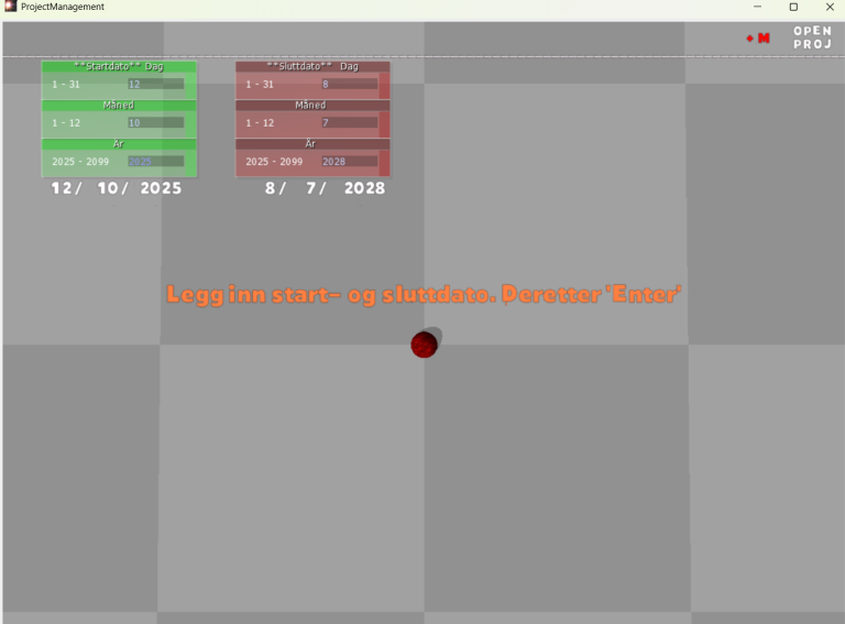 Laget skjemaer for start- og sluttdatoer.Dette skal jeg bruke til å definere milepæler i programmet. Når jeg får på plass lagringsfunksjonen, så skal jeg begynne på innlastning av prosjekter og visualiseringen av milepælene. Visualiseringen er per nå bare en rød…